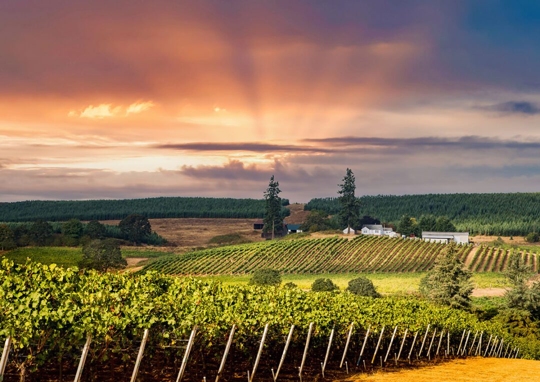 Golden hour sunset over Willamette Valley vineyard rows with dramatic sky